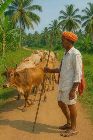 നീളമുള്ള ഒരു വടി എപ്പോഴും കയ്യിലുണ്ടാവുമെങ്കിലും മണിയാപ്പക്കും കാലികൾക്കും അതിൻ്റെ ഉപയോഗമൊന്നും ഇല്ല. അയാളുടെ നോട്ടം തെറ്റി അവ എവിടേയുംപോവുകയുമില്ല. രാവിലെ കിട്ടുന്ന ചൂടുള്ള കാടിയേക്കാൾ അവർ കൊതിച്ചത് മണിയാപ്പയുടെ സ്നേഹം നിറഞ്ഞ തണുത്ത തലോടലിനായിരുന്നു.